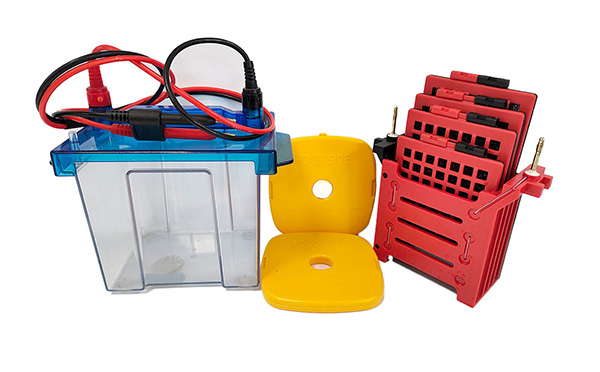 Improved productivity – Reduce heat and improve electrophoresis by placing platinum wire in the middle. Transfers four gels simultaneously.